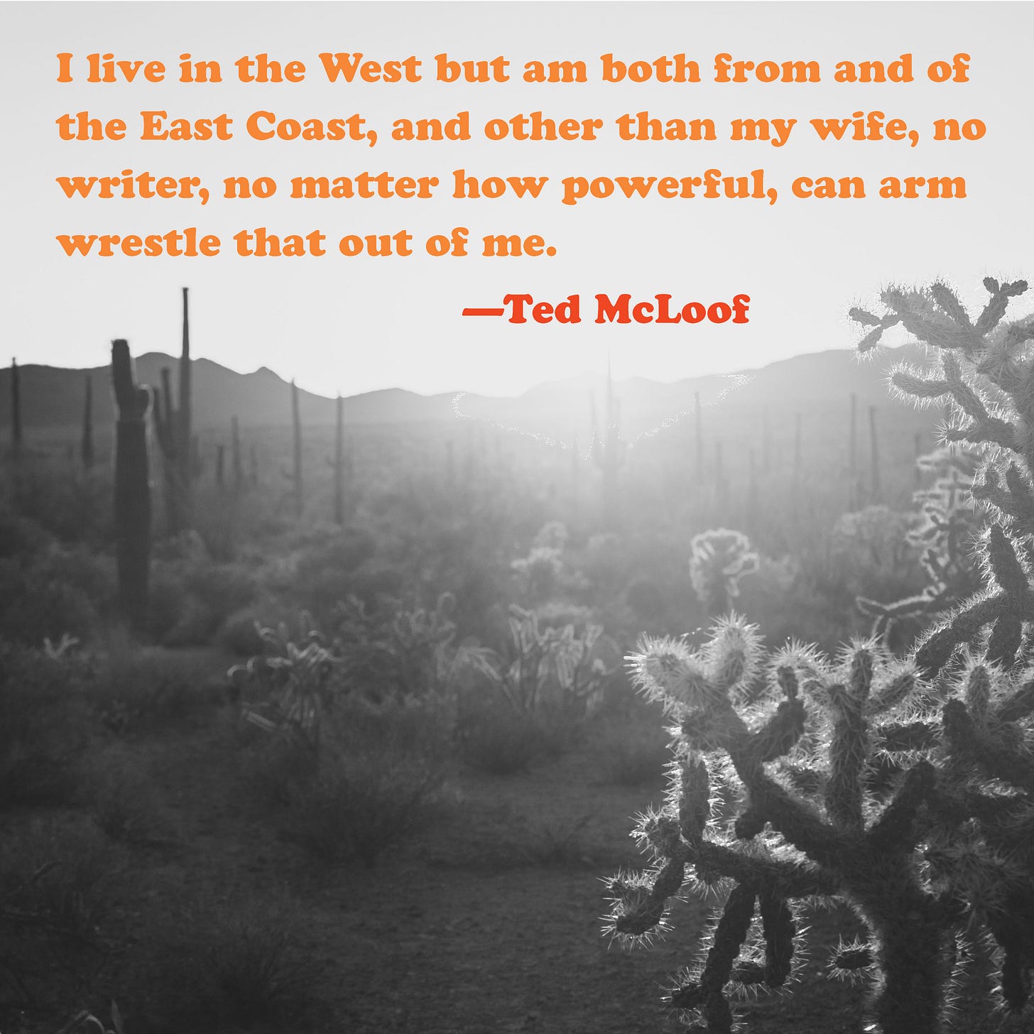 Ted McLoof: Maybe there’s a third preposition, being of that place, that works better. I’ve been in Tucson for 17 years now so I get what you mean and I do feel there are parts of it that feel like home to me. But there’s a sensibility in the Southwest that’s almost antithetical to that of the Northeast that I appreciate but definitely don’t feel, and haven’t adopted. And it’s not like I resist adopting it; the Northeast, the tri-state area, New Jersey, is just in my blood. So maybe that’s the difference–when you’re from a place you don’t ever shake it, and even if you want to, you stop trying after a while because it’s futile.